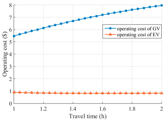 where denotes the free-flow speed () and denotes the free-flow travel time (). For example, if we let , , , and , we curve the network-related operating cost functions of the EV and GV, as shown in Figure 1.