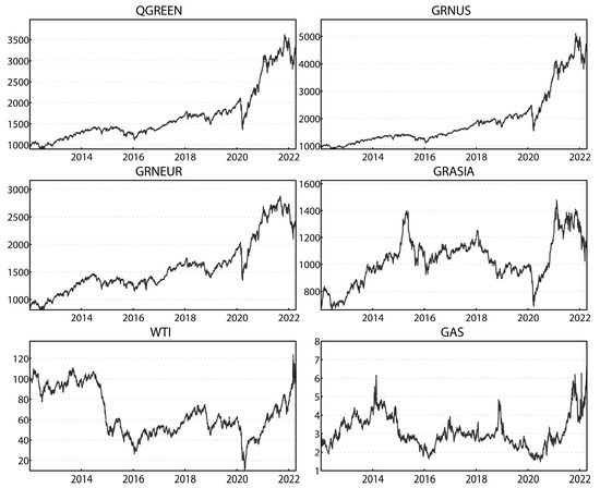 The NASDAQ OMX Green Economy Index Family includes companies involved in advanced materials, clean fuels, energy efficiency, renewable energy generation, healthy living and green buildings. It tracks the stock price performance of these companies across industries associated with the sustainable economic model in every sector. We select the NASDAQ OMX Green Economy Index (QGREEN), NASDAQ OMX Green Economy US Index (GRNUS), NASDAQ OMX Green Economy Europe USD Index (GRNEUR) and NASDAQ OMX Green Economy Asia USD Index (GRNASIA), as these reflect the degree of green economy development in the global, U.S., European and Asian regions, respectively. Crude oil and natural gas are two important components of traditional energy, and the West Texas Intermediate (WTI) and natural gas (GAS) futures prices represent the benchmarks for crude oil and natural gas markets, respectively. We therefore select the WTI and GAS futures prices as proxy variables for traditional energy markets. The sample period is from 4 January 2012 to 12 April 2022, and the sample consists of 14,340 daily observations. This covers several turbulent periods and crises, including the 2014 sharp drop in oil prices and the COVID-19 pandemic. The NASDAQ Green Economy Index data are obtained from the Quandl database, and the crude oil and natural gas data are obtained from the U.S. Energy Information Administration (EIA).