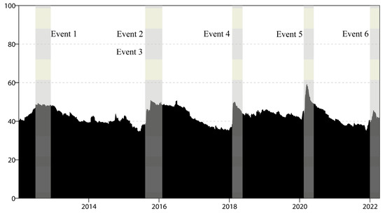 Dynamic “TOTAL” spillover based on the time domain. Note: This figure shows the time-varying behavior of the total return spillover index among 4 green economy markets and 2 traditional energy markets under study computed using the approach of Diebold and Yilmaz (2012) [12] and important events over time. “TOTAL” represents the total- spillover of the “green economy–traditional energy” system, as shown in Equation (7). Timetable for important events: (1) Event 1: European sovereign debt crisis, crude oil supply and demand imbalance (June 2012); (2) Event 2: Global stock market crash (24 August 2015); (3) Event 3: Global crude oil oversupply with uncertain demand outlook and oil price slump (24 August 2015); (4) Event 4: U.S. stocks plunge (5 February 2018); (5) Event 5: Outbreak of the COVID-19 pandemic; WHO classified the COVID-19 pandemic’s outbreak as a public health emergency of international concern (30 January 2020); (6) Event 6: The deteriorating situation in Russia and Ukraine and the disruption of crude oil and natural gas supply (January–February 2022).