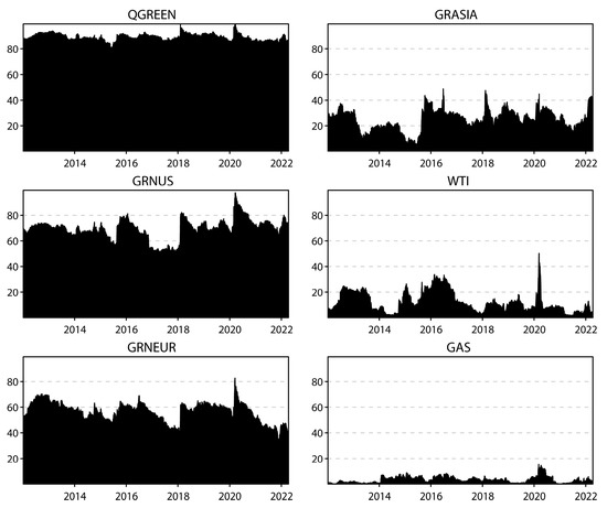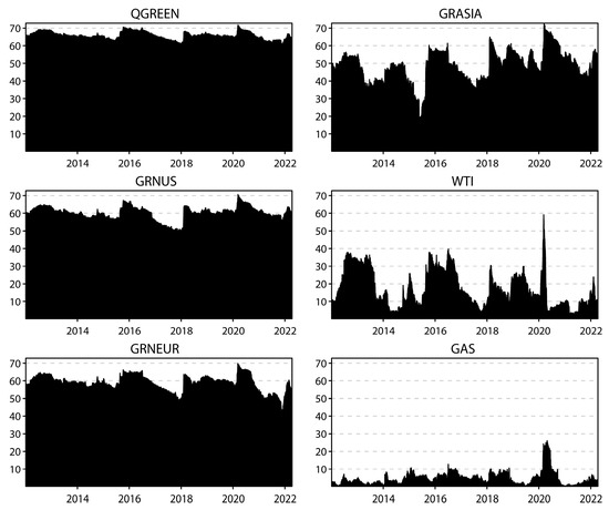 Dynamic “FROM” directional spillover based on the time domain. Note: This figure displays the time-varying behavior of the “FROM” directional return spillover index among 4 green economy markets and 2 traditional energy markets under study computed using the approach of Diebold and Yilmaz (2012) [12]. “FROM” represents the directional return spillovers received by the corresponding market from all other markets, as shown in Equation (8).