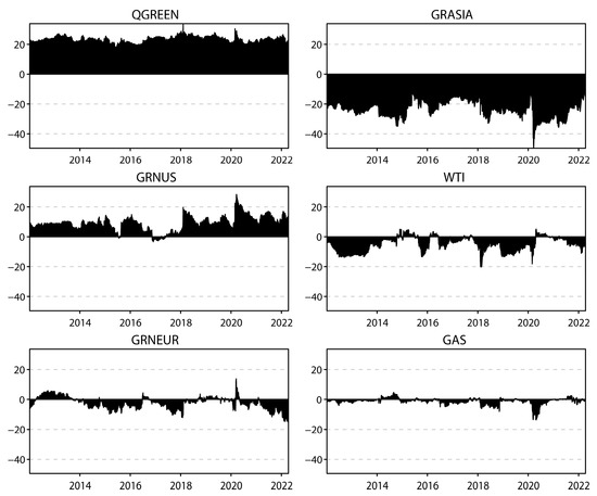 Dynamic “NET” directional spillover based on the time domain. Note: This figure depicts the time-varying behavior of the net return spillover index among 4 green economy markets and 2 traditional energy markets under study computed using the method of Diebold and Yilmaz (2012) [12]. “NET” return spillover indices are calculated by subtracting directional “TO” spillovers from directional “FROM” spillovers, as shown in Equation (10). Positive (negative) values of spillovers indicate that the corresponding market is a net transmitter (receiver) of return spillover effects “TO” (“FROM”) all remaining markets of the system.