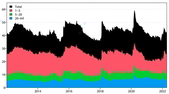Dynamic “TOTAL” spillover based on the frequency domain. Note: This figure depicts the frequency dynamics of the total return spillover among 4 green economy markets and 2 traditional energy markets under study computed using the method of Barunik and Krehlik (2018) [15]. “TOTAL” represents the total- spillover of the “green economy–traditional energy” system, as shown in Equation (16). The blue area indicates the total spillover in the long-term period of 20–infinite days. The green area reflects the spillover in the medium-term horizon of 5–20 days. The red area represents the spillover in the short-term horizon of 1–5 days. The black area is the time domain spillover.
