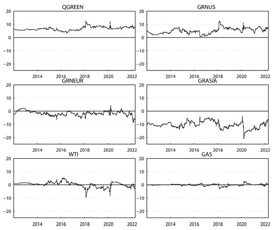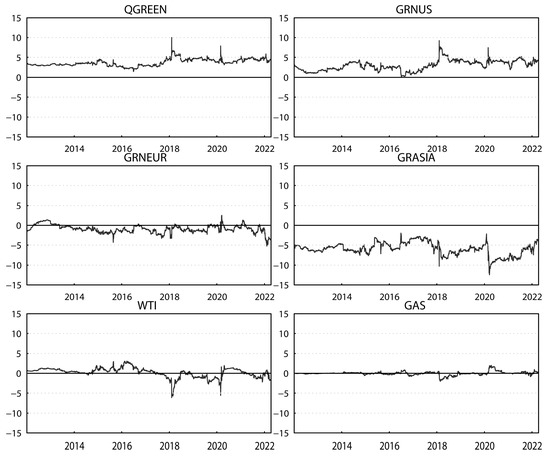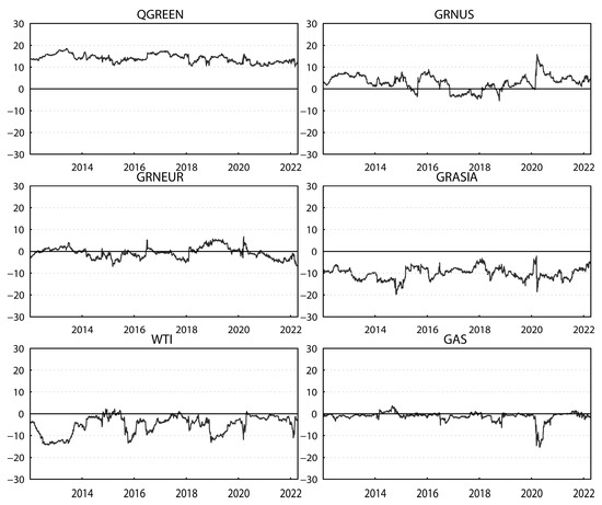 Table 2 shows that approximately 42.57% of the forecast error variations can be explained by the spillovers between the total regional green markets and traditional energy markets. This indicates that the spillovers in the system composed of green economy markets and traditional energy markets are significant over the sample period. The significantly positive “NET” values for the global and the U.S. green economy markets indicate that the two markets are net exporters of shocks, whereas the other markets are net recipients of systemic shocks. The spillover effect between the U.S. and Europe green economy markets is greater than those between the U.S. and Asia or Europe and Asia. The global green economy market has the largest effect on other markets. For example, it contributes 34.55% of the U.S., 29.46% of the European and 18.89% of the Asian green economy market spillover. The contribution values of the U.S., European and Asian green economy markets to the global green economy market are correspondingly larger than those of the crude oil and natural gas markets to the global green economy market. Therefore, the results show heterogeneity in the price interactions within green economy markets.
