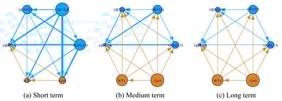 In Panel B of Table 4, the spillover effects are decomposed into short, medium and long terms. Figure 10 plots the net pairwise directional spillovers between green economy markets and traditional energy markets during the COVID-19 period. The lines in Figure 10a are clearly thicker than those in Figure 10b,c, indicating that the spillover levels in the short term are significantly higher than those in the long and medium terms, both in the total and directional spillover indices. The greater number of blue lines in Figure 10a indicates that the net spillover level of the global green economy and regional green economy markets to other markets is higher in the short term, and the traditional energy market is more vulnerable to this short-term impact. However, this situation changes in the medium and long terms. In Figure 10b,c, the number of orange lines increases, and the nodes representing WTI and natural gas markets become larger, indicating that the spillover capacity of the green economy market weakens in the medium and long terms, and the net spillover scale of the traditional energy market increases accordingly. In addition, the global and U.S. green economy markets mainly transmit spillover effects, regardless of whether it is in the short, medium or long terms, and the Asian green market is the main recipient of the spillover. Moreover, the net spillover direction in the short term is exactly the same as that found in the time domain. Clearly, the spillover effect during the pandemic was mainly driven by shocks in the short term. During this period, green sector stock indices plunged, and the prices of crude oil and natural gas fluctuated dramatically due to market sentiment, herding effects and other market factors. The correlation between the two is strengthened in the short term.