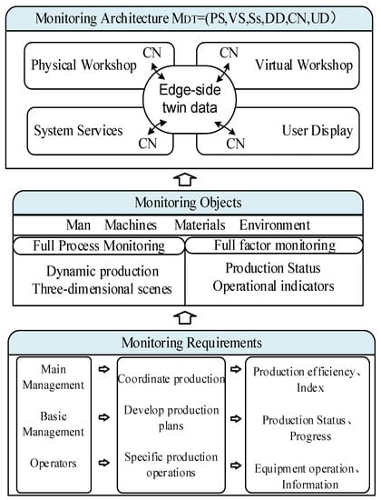 To fulfill the monitoring requirements of the personnel at every level of the workshop-production process, this paper proposes a six-dimensional architecture for the digital twin monitoring system, as illustrated in Figure 2. The system achieves comprehensive and process-oriented monitoring of physical workshops by providing services such as monitoring production efficiency, production status, and dynamic production processes in a virtual workshop.