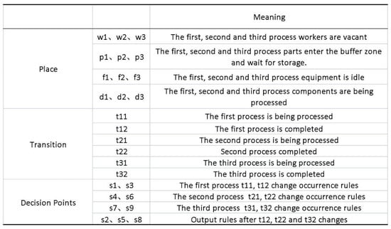 indicates the change rule. The token in the decision point in the ESHLEP-N can be reused, but instead of moving out from the output library to the input library, the token is moved out to the corresponding output library with the workshop event as the trigger condition. Take the first work station of the moving-arm production as an example, the work step can be divided into: 1. Moving-arm-parts group-pair assembly; 2. Moving-arm group-pair internal welding; 3. Moving-arm top-plate welding. Then, p1 means the group-pair part input buffer waiting library, w1 library means the group-pair assembly worker is idle, f1 library means the group-pair machine is idle, and so on.When a pairing task is issued, token I1 of the production plan will be available in library p1, and tokens a1 and b1 will be available in libraries w1 and f1 when both workers and pairing machines are idle, forming a combination token <a1, I1, b1>. Then, according to the decision point s1 rule, the change t11 is triggered by the workshop event (such as the production plan being issued or the required resources being idle) to start the first process, to start the pair assembly of the moving arm, and the combination token <a1, I1, b1> is consumed to form the token to enter the d1 library, which is in the process of the pair assembly of the moving arm; then, according to the decision point s3 rule, t12 is triggered in real-time to complete the pair assembly of the moving arm. The complete pair-assembly task is completed in real-time according to the decision point s3 rule.