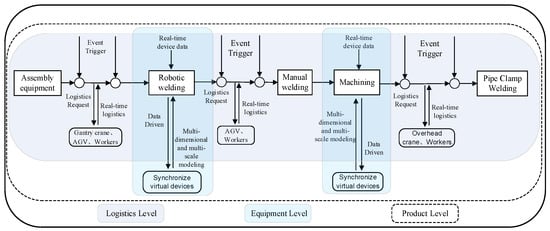 The workshop “state event” can basically map the workshop-production dynamics, but if we want to specifically show the real-time accurate dynamic mapping of workshop-production resources, we still need to build multilayer-mapping rules in the ESHLEP-N model. In this paper, based on the data-driven shop operation, the mapping system is built based on three levels of logistics, equipment, and products, as shown in Figure 6.