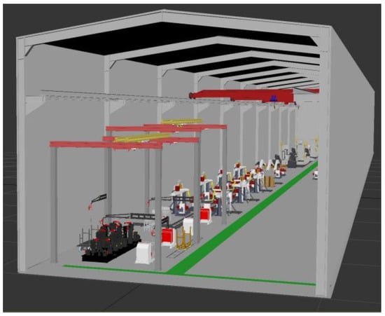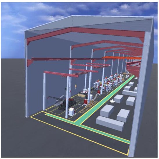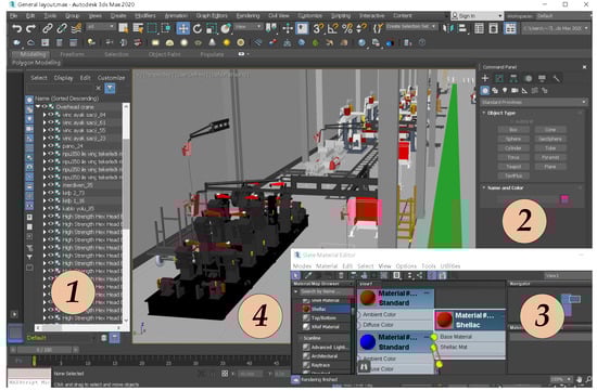 Figure 7 shows the layout of the main page of the 3D modeling software 3ds MAX, where the first part is the scene-resource manager of the model, which manages the workshop-equipment-model resources, describes the parent–child relationship structure of the workshop-equipment model, and portrays the behavior dimension of the workshop model; the second part is the building block of the geometric model of the workshop equipment, and the display of the geometric structure of the equipment model is in the fourth part; the third part is the scene-material editor, which expresses the physical attributes such as color, material, and the diffuse reflection of the workshop model. After the workshop equipment is constructed, it is laid out according to the workshop space to form the production-line structure. Figure 7 shows the layout of the complete production line of the movable-arm production workshop.