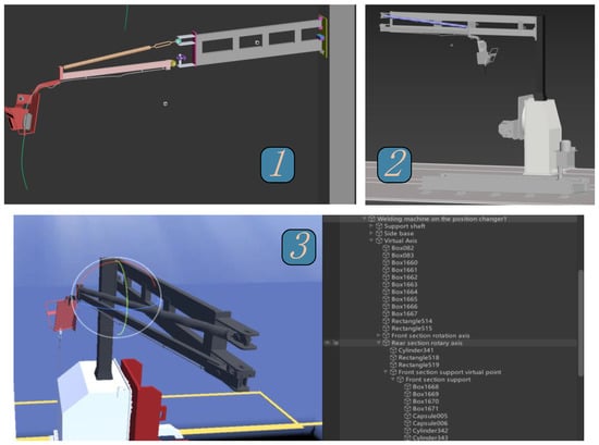The virtual-workshop-modeling process is illustrated by taking the welding machine on the displacement machine in the grouping station as an example. Firstly, the geometric-dimension model of the welding machine is completed in 3Ds Max based on the welding-machine data in the workshop, such as size and location, as shown in marker 1 in Figure 8. Secondly, the physical-dimension model is completed by assigning materials, as shown in marker 2 in the same figure, to make it look more like a metal material. After the lightweighting process, the model is exported as an .fbx file and imported into Unity3D for texture rendering to make it more realistic, as shown on the left side of marker 3. Multidimensional modeling in the modeling process is shown on the right side of marker 3, where the construction of submodels is completed first, and then the complete welder model is achieved through the fusion of layers. Finally, the model is driven by interactive operations, and the other models in the workshop are built in the same manner.