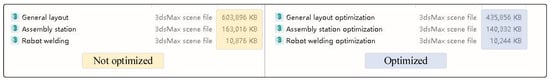 Due to the large number of workshop models, in order to prevent the system from loading jams, the geometric model needs to be lightened during the modeling. This paper proposes three optimization methods: ① in the geometric modeling process, the rectangular modeling method with fewer points, lines, and surfaces can be used compared to the curve modeling; ② on the premise of ensuring the geometric characteristics of the model, the unnecessary points, lines, and surfaces of the model are refined and optimized, such as without affecting the model function, which optimizes the internal structure of the model without affecting the model function; ③ the modeling software comes with an optimization function to optimize the model, such as the professional optimization modifier of 3Ds MAX, which can select points, lines, and surfaces for percentage optimization. Due to the many workshop models, we only selected the robot-welding-station, assembly station and the general layout of the model to do a comparison is shown in Figure 11.