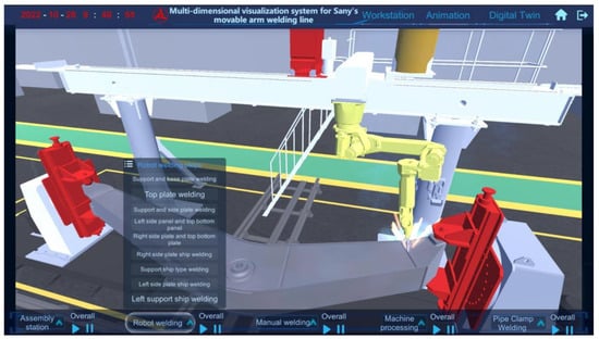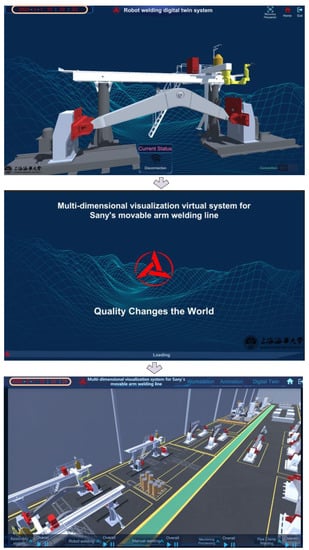 In workshop production, a complete production process of a manipulator arm requires a significant amount of time. We aim to rapidly understand the technological flow information of the production line through dynamic simulation. Using the 3D modeling software 3Ds Max, as well as the Unity 3D simulation animation function, the production time is scaled equally, and we can complete the detailed production simulation of the whole production-line process in a short time. Figure 17 shows the production simulation process of the front and rear support and side-plate welding-seam steps of the robot-welding station, which can be clicked on to view the single-step process and the complete production process.