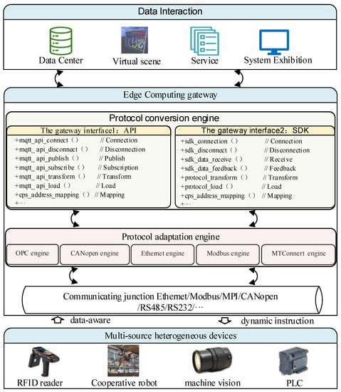 The CN dimension is responsible for achieving bidirectional data mapping between the PS and VS dimensions. However, due to the different communication protocols used by the physical shop equipment, the key to achieving the digital twin shop lies in how to extract the data that can accurately represent the production status of the PS from the large amount of heterogeneous data from multiple sources in the shop. The underlying equipment-sensing data in the workshop mainly has protocol data (such as bus type, API data, etc.) and sensing data. Protocol data can be collected directly by software, by collection box, protocol conversion, etc.; sensor data collection is done by the data collector. However, there are many workshop devices and the protocol standards are not the same. In order to reduce the difficulty of workshop data collection and management, and to facilitate the efficient deployment of the digital-twin-workshop-monitoring system, this paper adopts the data-collection and management method based on edge-computing gateways in industrial IoT as the service platform, as shown in Figure 13.