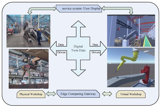 Regarding better human–machine collaboration and human–machine interaction for digital twin workshops, Jian Zhang [21] developed an information–physical-machine tool based on edge-computing technology to realize remote sensing, real-time monitoring, and remotely interactable high-performance digital twin applications. George J. Tsinarakis [22] combined Petri nets with modeling tasks in the development process to enable human–machine collaboration and information interaction in the digital twin monitoring process of electric vehicle design, manufacturing, and assembly. Jasper Wilhelm et al. [23] analyzed the integration and interaction of human and digital twins in intelligent manufacturing systems according to the PRISMA-Scr approach, presented state-of-the-art DT-based human–machine interaction (HMI) and its impact, and proposed future research directions. Tian Wang [24] proposed a collaborative human–machine-modeling approach based on digital twins in the direction of smart manufacturing, and implemented the technology, as well as the human–machine interaction of the product, in a case study.