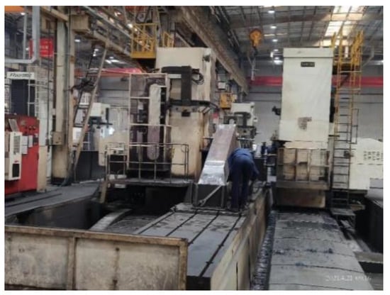 Firstly, we analyze the spatial geometry of the workshop equipment and use 3Ds MAX software to model the geometry of the production-line equipment, give the model materials, map and adjust the parent–child relationship constraints between the equipment parts in the modeling process, and finally finish the multidimensional and multiscale construction of the production-line equipment through multilevel model fusion. The workshop model is imported into Unity 3D into the .fbx format to add lighting components, physical collision, spatial-position components, material mapping, particle effects, etc., to achieve the spatial layout and rendering of the workshop equipment. Moreover, in the user interface, the detailed process of each workshop workstation will be displayed. By clicking on the workstation button, it will jump to the corresponding workstation position, where the viewpoint can be rotated by keyboard and mouse, as well as provide first-person automatic scene roaming. Figure 15 shows the actual workshop machine-processing stations, and Figure 16 shows the monitoring system machine-processing station navigation.
