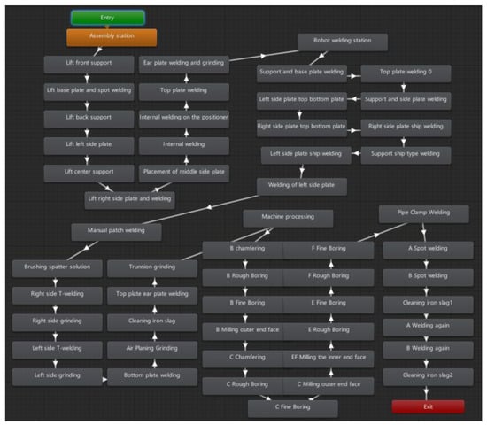 The digital-twin-workshop monitoring system uses the state machine in Unity3D to enable the dynamic monitoring of the production process based on the Petri net. The state machine describes the system’s behavior and transition rules between states, corresponding to the event model in the Petri net. When certain events, such as the completion of the processing in the previous station or the start of the next equipment process, are detected, the state machine makes decisions and triggers state events to drive the model operation in Unity3D, achieving the dynamic mapping of the production data. Figure 18 illustrates the state machine model, which includes the entire production process at five stations in the workshop. As the state transitions, the system triggers the next stage of behavior until the production operation is completed.
