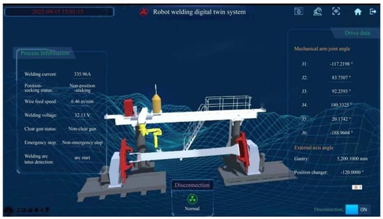 Figure 14 shows the robotic-welding workstation, which uploads the collected workshop-equipment data (such as the welding current, robot-arm joint angle, wire current, voltage, and other information) to the IoT platform for storage and invocation through the edge-computing gateway, and drives the operation of the VS model by converting real-time data into workshop events (equipment start/stop, etc.) to achieve the real-time data-visualization mapping of the robotic-welding production process.
