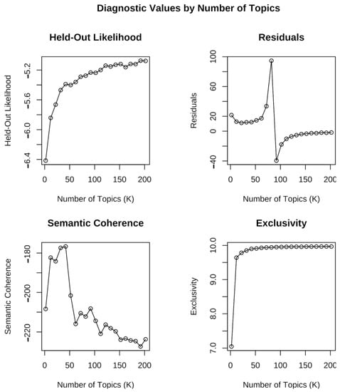 In topic modeling, researchers need to specify the parameter K. The value of K represents the number of topics in topic modeling. The machine cannot automatically decide this value, which requires human input. There are three main methods for the selection of the K-value: perplexity (held-out likelihood), exclusivity, and semantic consistency. Scholars regard perplexity as defective among them, so the selection of K-value in recent publications has rarely relied on perplexity. This article uses four methods, namely method semantic coherence, exclusivity, residuals, and held-out likelihood, to select parameter K. Semantic coherence is maximized when the most probable words in a given topic frequently co-occur together. Mimno et al. [] showed that the metric correlates well with human judgment of topic quality. Let D(, ) represent the number of times the words and appear together in a document. Then, for a list of the M most probable words in topic k, the semantic coherence for topic k is given as Equation (1). Because the range of values inside the logarithmic brackets on the right is (0,1), a larger semantic coherence indicates that there are more co-occurrences of words within each topic in the model, which means that the model is better.