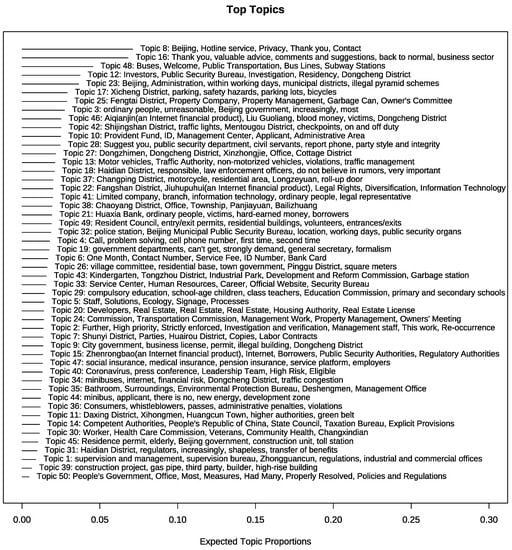 Topic modeling has been applied to politics, public administration, and media studies with the focus on analyzing relevant texts. Researchers investigate the research–practice gap in public administration by topic modeling the titles and abstracts in Public Administration Review and articles in Public Administration Time []. It can also be used to explore the political consequences of online expression by comparing the topic of online public messages and public policies in China []. In addition, another area of applying topic modeling is to analyze journalistic texts, as there is large number of texts produced in this field [,,]. However, certain limitations of this method exist, as it requires tailored validation and cannot replace human reading and thinking [].