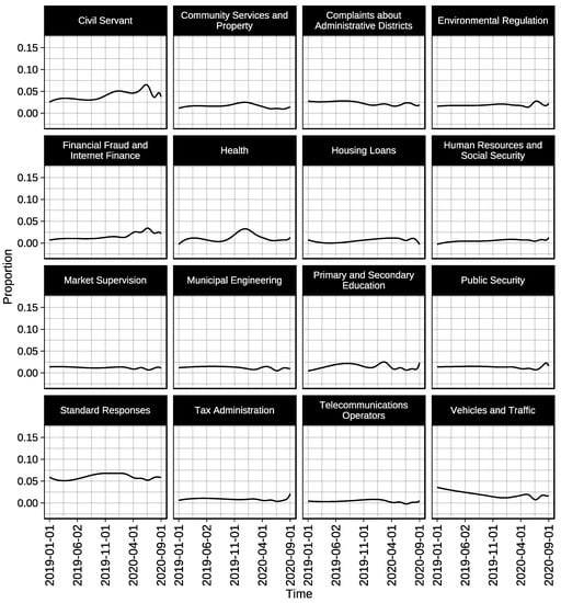 Understanding the evolution characteristics of topic clusters is necessary because they may reflect substance concentration and environmental change, both of which can affect the characteristics of inputs to the political system. Figure 3 illustrates the evolution of average proportions of 16 topic clusters from 2019 to 2020. Most of them present relatively steady trends by positioning their propositions between 0% and 5% throughout these two years, while some other topics present advantaged proportions or obvious fluctuations. The evolution of the average proportion of the cluster standard responses is steadily above 5% for most of the time, which echoes the surprising repetition of standard response illustrated earlier in this paper. It also demonstrates the severity of ineffective responses in the form of general and standard replies, which can be regarded as “output failures” of the political system []. In addition, the evolution depicts the impact of environmental change on the political system. As the environment influences “input” [], a change in the public health environment in early 2020 may increase the volume pressure on the political system, as evidenced by the sudden lift of the health cluster curve. This is possibly due to the outbreak of COVID-19, which can be regarded as a sudden alteration of the environment and caused the concentrated public concerns posted online.