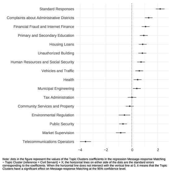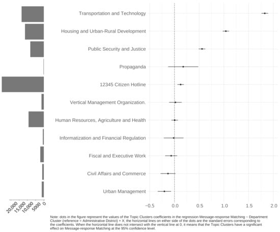 Different from the coordination of the content pressure, digital technology as the information channel reduces the sensitivity of the political system to the volume pressure. Evidence supports that the volume of online public messages does not really form output pressure for this political sub-system in the online response process. The government departments receiving a large number of online inquiries may not easily generate responses containing distinct topics with the initial public messages. Although the traditional political system theory argues that the volume of inputs may form stress to damage the capacity of the political system to generate certain output [], it seems like there is no existence of the volume pressure in this case where digital technology works as information channel. In contrast to the classic theory, most clusters of government departments4 receiving a large number of online public messages tend to align their replies quite well with the topics of the initial public inquiries, with typical examples including transportation and technology, housing and urban–rural development, public security, and justice (Table 2) (Figure 5). Clusters of government departments receiving a relatively small number of messages, on the other hand, may not perform well, with high chances of generating an unmatched response. A typical example is urban management, which receives a relatively small number of messages but has a significant negative effect on message-response matching at the 95% confidence interval. Easton (1965) introduced the concept of “excessive volume stress” to describe the negative impact on the political system’s ability to generate output when the amount of inputs exceeds the processing capacity of the political system []. Contrary to this assertion, despite the fact that the work load suffered by those clusters of departments receiving a relatively large number of inquiries seems much higher than the work stress of other clusters, they still successfully generate official responses to align effectively with the public inquiries. Together with the verification of the content pressure in the above section, it seems like the content of the initial public message posted online matters much more than its volume in exerting impact on the government response to align with the public inquiry. Hence, the hypothesis (H1b) is not supported in this study: the large number of public messages received by certain government departments does not necessarily lead to the high possibility of generating an unmatched official response.