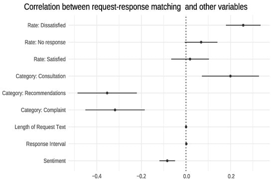 After analyzing the potential pressure brought by content and volume, we shift the focus to sentiment. The application of digital technology has not adjusted the sensitivity of the political system to emotion or sentiment. Sentiment generates a significant impact on message-response matching. The more emotional the online message is, the less likely it is the government’s response will align well with the initial inquiry. The public messages posted online to some extent can be regarded as interest expression by the public. As argued by Gabriel Almond, the more emotional the expression of interest, the more difficult it is to be integrated and transformed into public policies []. This is because, as information, input with strong emotion makes analysis and reasoning difficult. The political system cannot easily evaluate or weight emotional information, making effective incorporation into the flow of political output difficult []. This reasoning about the impact of emotion is also well supported by the evidence of the Chinese government’s online response. The logistic regression of the absolute sentiment and whether the reply matches the message reveals that if the absolute sentiment increases by one unit, the possibility of the government response matching the initial inquiry decreases by around 4%, with the correlation coefficient being −0.157 and p < 0.001. As Figure 6 presents, the standard error of the correlation between the sentiment of the public message and the topic matching is very small. Therefore, the hypothesis (H2) is supported: the stronger the emotion of public messages, the more difficult it is for them to trigger a matched e-government response.