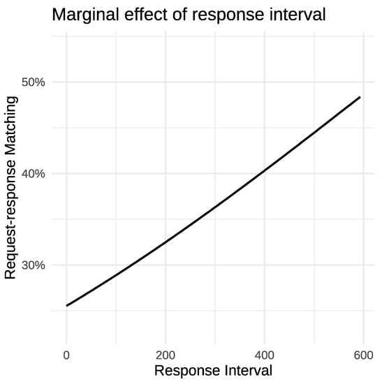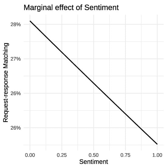 In addition to topics and sentiment, the length of time that the government department takes to respond can also influence the possibility that the official response can match the public message. The government’s activities are perceived as a “steering” process, which is understood as ongoing movement, continual adjustment of strategy, and sensitivity to the environment []. All of these activities are guided by communication flows and feedback [], which take time for the political system to effectively respond to. “Lag” refers to the time taken by the political system to react to information, and “gain” means the extent of government reaction []. The longer the “lag” is, the smaller the possibility for the political system to achieve the goal []. Following this logic, the longer the political system takes to consider the information contained in the online inputs, the less efficient the official outputs are, and the less likely it is for the official response to match the public message. The Chinese e-government response data verify that time constraints do exist, but their function in the political system changes in the digital response context. As shown in Figure 6 and Figure 9, the response interval is positively correlated with whether the government response matches the public message, although the point estimate value is only 0.002. The marginal effect of the response interval further verifies the positive relationship with the request-response match (Figure 10). With the response interval becoming larger, the percentage of request-response matches increases significantly. The marginal effect of the response interval demonstrates that the coefficient of the response interval in the dot-whisker plot underestimates its actual impact on the matching degree. Thus, the real-world operation logic of digital government response could be that it takes time for this political sub-system to adequately absorb and adopt information before generating suitable government reactions. The valuable information contained in communication and feedback requires a sufficient processing time before it can guide the adjustment of strategy and the movement of the political sub-system. Therefore, the hypothesis (H3) is not supported, as evidence shows that the longer government departments take to respond to public messages, the more likely it is that the official response matches the initial inquiries.