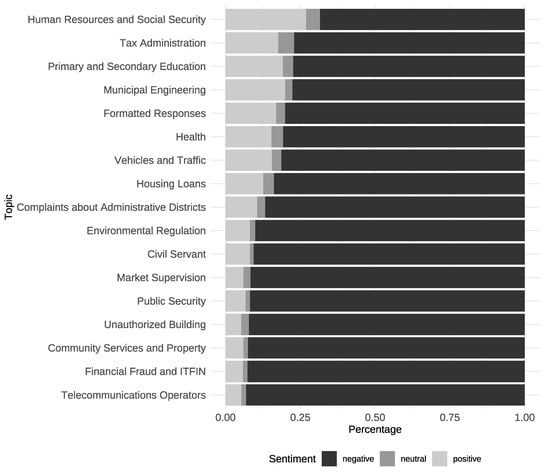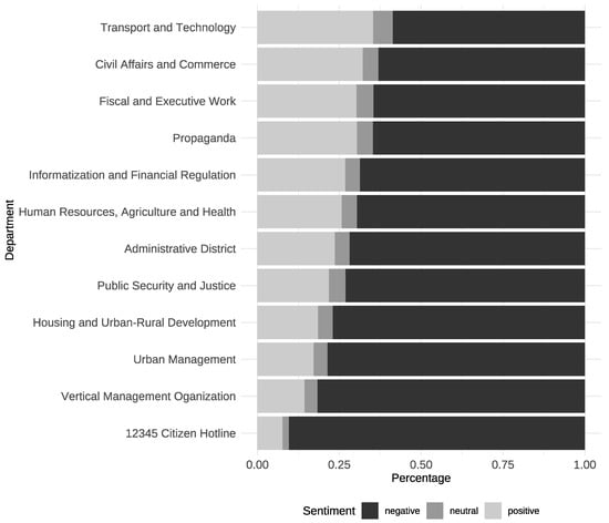 We cannot separate sentiment from other factors as they are closely connected to each other. The characteristics of sentiment distribution reveal that negative sentiments prefer to appear in certain categories of messages, government departments, and topics. The Beijing Municipal Government website classifies the public messages posted there into four categories including consultation, suggestion, complaint, and report. The percentages of messages with negative sentiments in the categories of complaint (90.49%) and report (96.52%) are much higher than those percentages in the categories of consultation (71.00%) and suggestion (53.44%) (Table 3), which justifies the result of sentiment analysis. From the perspective of government departments, clusters of the 12345 citizen hotline, vertical management organization, and urban management contain much higher percentages of negative sentiment compared with clusters of transportation and technology, civil affairs and commerce, and fiscal and executive work (Figure 7). For sentiments in specific topics, topics in clusters of telecommunications operations, financial fraud and ITFIN, and community services and property contain relatively higher proportions of negative sentiments than topics in clusters of human resources and social security, tax administration, and primary and secondary education (Figure 8).