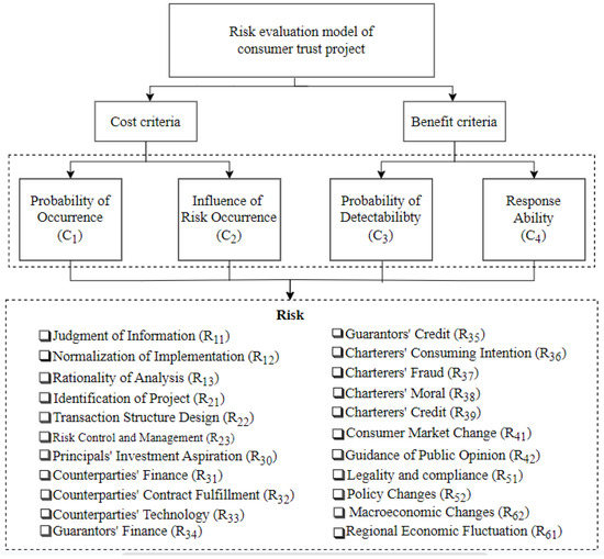 Ultimately, the hierarchical structure of the consumer trust project evaluation problem is established in Figure 2. As can be noticed in Figure 2, the risk evaluation model consists of 4 risk criteria, 16 internal risks, and 6 external risks. Based on the above analysis and discussions, the problem of the risk evaluation of consumer trust projects could be regarded as a classic multiple criteria decision-making issue [4].