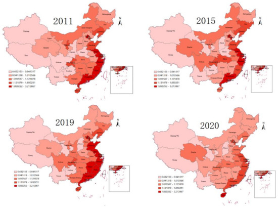 Considering that the principal component analysis method forms independent principal components after transforming the index variables of the original data, which can better eliminate the correlation influences among the evaluation indicators, this paper adopts the principal component analysis method to construct the measurement index of the green development level of the real economy of China’s provinces during 2011 to 2020. To further analyze the spatial divergence of the multi-year changes in the greening development of the real economy, four time points in 2011, 2015, 2019, and 2020 were selected, and the provincial level was taken as the boundary unit. The paper used Arc GIS to draw the spatial differentiation of the greening development level of the real economy (see Figure 1). Figure 1 shows that the real economy’s overall level of green development in China’s provinces is low, and the overall trend is rising. However, the rate of improvement is slow, and the development of each region needs to be coordinated. Due to the impact of the global new crown epidemic, many enterprises face difficulties resuming production, broken capital chains, or even closure in the face of the extensive quarantine and blockade and other preventive and control measures [32]. These conditions make the social unemployment rate rise, the consumption level decrease, the opening up to the outside world and the ability to bring in foreign capital decrease. Therefore, the real economy’s green development level peaked in 2019 and then declined in 2020. Figure 1 shows that although the level of green development of China’s real economy continues to improve, the development of East, Central, and Western China is not coordinated due to the inconsistency of the economic base, development stage, and industrial structure. The distribution pattern shows that the development in East China is higher than in Central China and in Central China, it is higher than in the West. The development level of the real economy in the eastern coastal areas is especially prominent. However, thanks to the application of China’s advanced technologies, such as big data, artificial intelligence and 5G in industrial industries, as well as other heavy pollution fields in recent years, the difference in the development levels of the greening of China’s real economy between East, Central, and West China in 2020 have been significantly reduced, and the level of regional green and high-quality development is more balanced than in previous years.