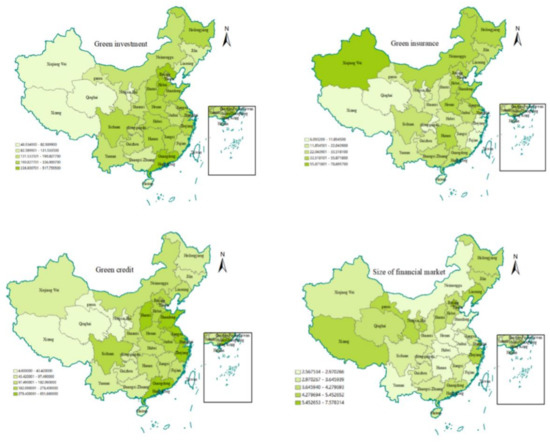 In order to study the current situation of the greening development of China’s financial market, the study selected green credit, green insurance, green investment, and financial market scale in China in 2020. Based on ArcGIS, the paper used the natural breakpoint method to classify the greening development of the financial market in 31 provinces of China into five levels. As can be seen in Figure 2, the greening level of financial markets in Eastern and Central China is significantly better than that in Western China. It is inextricably related to the fact that the provinces selected for the first batch of the green financial reform pilot zones established by the state in 2017 are mainly in Eastern and Central China, and it is also consistent with the fact that China’s economic development level is higher in the east and lower in the west. In terms of the scale of financial market development, the overall development of China is more balanced. However, the development of the central region is weak. The possible reason is that China’s central region is not conducive to the large-scale production of relevant commodity and the demand for green development of enterprises due to the treacherous geographical environment. The smaller enterprise scale output value has created a smaller regional financial market scale. In terms of green investment, the development of Eastern and Central China is more coordinated, but there is a big difference with that of Western China. The main reason is that green investment is mainly dominated by local governments, and the government supports related enterprises to carry out green transformation through funds and policies. Therefore, there are high requirements on the financial strength of local governments. The economic development level of the Eastern and Central China provinces is better than that of Western China, so the local governments have more sufficient funds to carry out green investment behavior. In terms of green insurance, China’s northern and central provinces are better developed than the southeast coastal coast and western regions. The reason is that China’s traditional energy-intensive industries are mainly in the northeast and need green insurance to protect their industrial structure for greening and to upgrade more than the coastal high-tech industries. In contrast to green insurance, green credit is mainly for encouraging the green and sustainable development of non-energy-consuming and high-tech enterprises with preferential interest rates. Thus, the level of green credit development in the eastern and southeastern coastal provinces is significantly better than in the central, western, and northeastern regions.