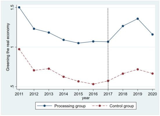In July 2016, the People’s Bank of China, the Ministry of Finance, and seven other ministries and commissions jointly issued the Guidance on Building a Green Financial System. The guidance specifies that China’s green financial system is an institutional arrangement that supports the transformation of the economy to green through financial instruments and related policies such as green credit, green bonds, green stock indices, related products, and green insurance. For the first time, China’s green finance was clearly defined and the connotations of the green financial system were enriched [42]. Therefore, in this paper, concerning the approach of Gao et al. [43], considering the lack of policies, the eastern and central regions of China need the support of green finance more than the western regions in order to carry out industrial green upgrading and transformation. The following model is set: treat is the policy dummy variable if the province is in the eastern or central regions of China, treat equals 1, otherwise, it equals 0; time is the time dummy variable, but in 2017 and later, it equals 1, otherwise, it equals 0.