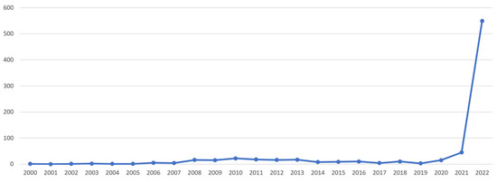 As a proxy for measuring hype, prior studies used the volume of related literature publications and related keyword search queries [11]. The following section describes these two metaverse indicators. First, 784 publications were found by searching the Scopus database using the keyword “metaverse” (see Figure 1). Studies related to the metaverse surged to over 549 publications in 2022, with most publications coming from China, the US, and South Korea, in that order.