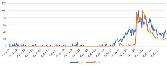 These trends indicate that the metaverse is receiving relatively high interest in Korea. This is due to the activeness of government policies and corporate activities regarding the metaverse. The Korean government aspires to take the lead in the metaverse market and plans to fund the development of the metaverse with KRW 9.3 trillion by 2022. An estimated KRW 2.6 trillion (approximately USD 2.2 billion) will be spent on blockchain, the metaverse, and other related technologies by 2025 [21]. Moreover, the Ministry of Science and ICT launched the Metaverse Economic, Social, and Cultural Forum on 30 September 2021, in order to predict and respond to the economic and social changes caused by the metaverse [22]. Owing to such active investment and support for the metaverse, interest in the metaverse is growing rapidly in Korea.