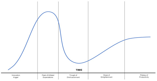 Hype is a concept that has been widely used in business but has recently begun to be used as a theoretical background for studying the diffusion and acceptance of technology in academia [11]. In particular, Gartner’s hype cycle model has gained substantial attention from practitioners; however, over recent decades, it has received rapidly increasing attention from the technology and innovation management literature [7,12].