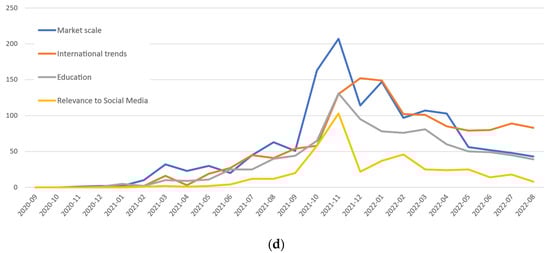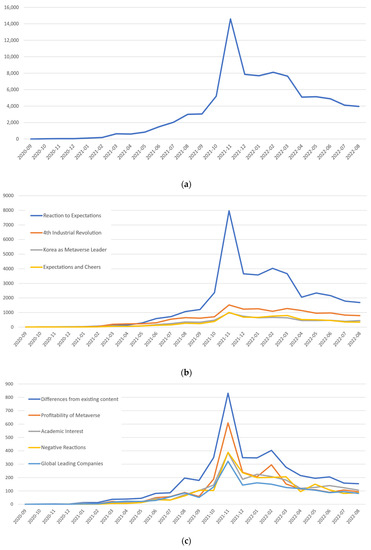 To answer research question two and thereafter determine whether timely patterns impacted topic proportions, the distribution of the extracted topics over time was analyzed. Figure 4 shows the frequency of the total number of tweets over time, and Figure 4a–c show the frequency of the number of tweets for each topic. Tweets including the keyword “metaverse” began to rise in March 2021 and continued to rise gradually until August 2021. The market scale topic increased significantly in March 2021 in response to the debut of Roblox, known as a representative metaverse game, on 10 March 2021. Before May 2021, topics about the “4th Industrial Revolution” accounted for the largest number of tweets. After May 2021, however, the topic of reaction to expectations to the metaverse recorded the greatest number of tweets.