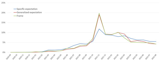 Furthermore, the distributions of the number of tweets for each expectation framework over time were analyzed (see Figure 5). The temporal patterns of the generalized expectations and frames were similar. However, the flow of specific expectations showed a difference, and more tweets were distributed from March to September 2021. The specific expectation showed a relatively small rise in October and November 2021. In addition, expectations showed a relatively small rise until it reached its peak in November 2021. Nearly 20% of tweets were on generalized expectations and frames themes which were distributed in November 2021, while only 11.8% were on specific expectations.