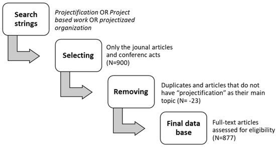 This section analyses and classifies the research on “Projectification” until 2022 by applying the quantitative method of bibliometric analysis. To reach this aim, four core steps were followed (Figure 1): (1) searching for keywords on Scopus and the Web of Science database; (2) selecting only the journal articles and conference types of publications, (3) removing duplicates and articles that lacked “Projectification” as their main topic, and (4) performing bibliographic coupling among the items. This resulted in 877 articles that fit our criteria.