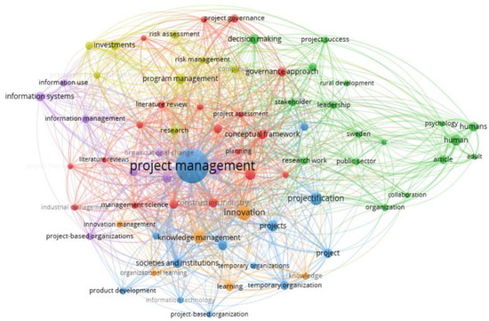 The project management cluster shown in blue, represents projects, society, institutions, temporary organisations, and project-based organisations [36,38]. Cluster 3 portrays the project organisational approach of projectification and indicates that organisations have been turning from operations to project management as part of their competitive advantage.