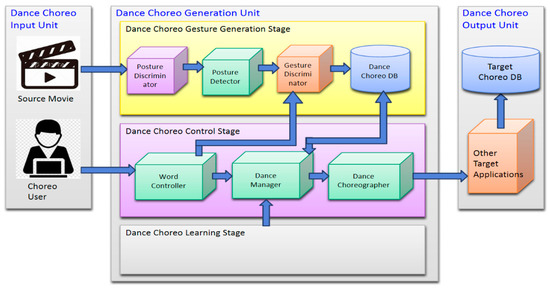 Figure 1 shows the proposed system for K-POP choreography creation, which is operated based on the Dance-Choreo-Input-Unit, the Dance-Choreo-Generation-Unit, and the Dance-Choreo-Output-Unit. The Dance-Choreo-Input-Unit defines a source video and the user, and the Dance-Choreo-Generation-Unit extracts postures and gestures from the source video and converts the extracted movements to creative choreography. The Dance-Choreo-Output-Unit applies the result of creative choreography as input data.