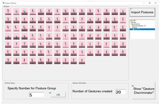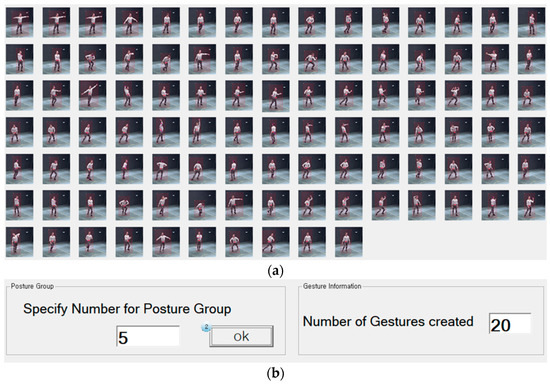 The posture detector automatically provides numerical indices to multiple postures generated by the posture discriminator. It receives the number of postures to be grouped, which is established by the user, to determine the number of postures that comprise a gesture. Figure 3a shows the postures of a dancing character including key points. Postures are indexed based on numbers ranging from 0 to 99. Figure 3b shows the process of receiving the number of postures to be grouped as input data to generate a group of postures, which is used to define a gesture. When the number of postures to be grouped is established, the posture detector determines the number of gestures by considering the number of the entire postures.