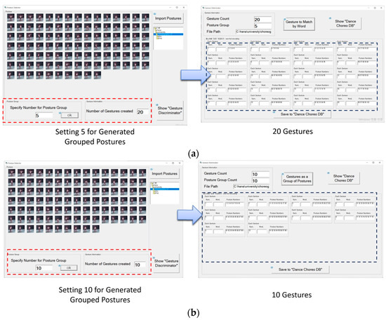Thirty generated gestures by grouping with postures, they should be listed as: (a) 20 generated gestures by grouping 5 postures; (b) 10 generated gestures by grouping 10 postures.