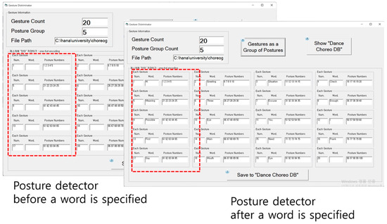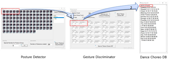 The gesture discriminator performs the following steps. First, it generates a gesture by dividing consecutive postures according to the number of postures to be grouped. A red dotted line box located at the left in Figure 5 shows a case where gestures are generated according to the number of postures to be grouped. Each gesture includes a gesture number and multiple posture numbers. A word box is left blank without a word input. Second, each gesture is selectively established by words defined and delivered by the user, who inputs these words by using the word controller in the Dance-Choreo-Control-Stage. The word input step is described in the corresponding section indicated below. A red dotted line box located at the right in Figure 5 shows a case where a word for a gesture is established. In this step, each gesture contains a gesture number, a gesture word, and multiple posture numbers.