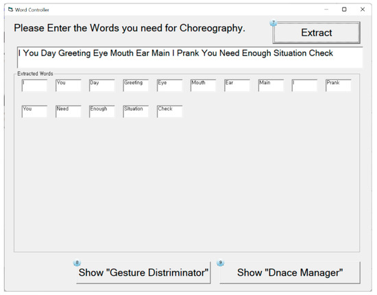 The word controller receives a series of words from the user or a producer who is willing to obtain the result of choreography. The user inputs words by using a keyboard, and the word controller extracts words to be used to compose a sequence of creative dance movements. The extracted words are used by the gesture discriminator and the dance manager as follows. The gesture discriminator allocates a word determined by the word controller to an automatically generated gesture to interconnect them. The dance manager searches a word determined by the user in the Dance-Choreo-DB and selectively matches a group of postures, which is established to generate the corresponding gesture, with the searched word. Figure 7 shows a screenshot of the word controller containing words randomly input.