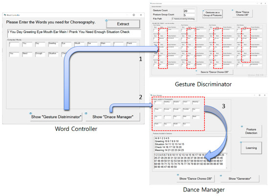 Figure 8 shows the step where gesture words are transferred to the gesture discriminator and the dance manager. The left image of Figure 8 shows the step where the word controller analyzes a series of words input by the user and divides these words into multiple words. The right images of Figure 8 show the gesture discriminator and dance manager called the word controller. The No. 1 arrow indicates a step where the word controller calls the gesture discriminator to convert the word determined by the word controller to a gesture word and record the converted word. The No. 2 arrow indicates a step where the dance manager detects the word determined by the user from the Dance-Choreo-DB and extracts posture numbers included in the corresponding gesture.