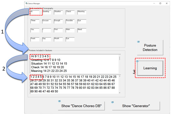 The dance manager detects gesture words stored in the Dance-Choreo-DB and lists posture numbers included in the corresponding gesture. The word controller extracts multiple words from a series of words input by the user according to the user’s intention. When the Dance-Choreo-DB includes a gesture word that corresponds to the extracted word, the dance manager extracts several posture numbers included in the corresponding gesture word. Creative choreography consists of a series of gestures, each of which contains several posture numbers. The proposed system is trained based on the Bi-LSTM technique to automatically control the level of creativity, preference, and difficulty. Figure 9 shows a step where the dance manager detects and arranges several posture numbers from multiple gesture words. The No. 1 arrow indicates a step where the dance manager detects a gesture word from the Dance-Choreo-DB. The No. 2 arrow indicates a step where the dance manager detects several posture numbers that belong to the corresponding gesture word recorded in the Dance-Choreo-DB. When the user clicks the Learn button marked by the No. 3 red dotted line box, the proposed system learns the level of dance creativity, preference, and difficulty by using the Bi-LSTM technique and updates the arrangement of posture numbers.