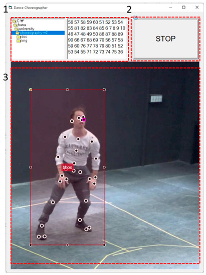 The dance choreographer analyzes gestures generated by the dance manager and creative choreography updated by the Bi-LSTM technique. The purpose of the proposed system is to generate creative choreography through the aforementioned processes. Figure 10 shows a screenshot of a video of a character dancing based on the creative choreography derived from the proposed system. The No. 1 part indicates records of posture numbers learned by the proposed system, the No. 2 part indicates a necessary controller for playing the video, and the No. 3 part indicates an area that displays the creative choreography derived by the proposed system.