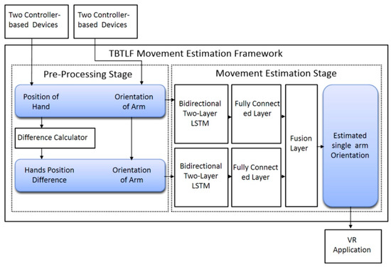 It is recommended to reduce the number of sensors used to estimate movements in movement estimation techniques due to the high cost of wearable sensors. A few existing movement estimation algorithms based on Bayesian probability and K-means are used to estimate movements of body parts, which are not monitored, by considering movements directly measured by sensors [8,9]. Bayesian probability was first adopted in a movement estimation technique to estimate the movements of arms [10]. Two armbands were used to detect these movements, and the measured results were displayed as coordinate values in the direction of the target arm. Measurement data were classified according to angles ranging from −180° to 180° at the interval of 30°. The movement of the upper arm was estimated based on the maximum Bayesian probability between the angle of the upper arm in the initial place and that of the upper arm in the adjusted place in the direction of the movement. An armband represents the movement of an arm (the upper arm and forearm). Subsequently, an enhanced movement estimation technique based on Bayesian probability was developed. This method accurately estimates movements by determining a range of angles by using the minimum and maximum values of measured data instead of a fixed range of angles from −180° to 180°. This method was used to estimate the direction of the forearm based on the location of a hand connected to the forearm [11]. An armband was used to detect the direction of the forearm, and a VIVE controller was used to collect data on the location of the target hand. This technique estimated the direction of the target forearm, which was not measured, based on the location of the hand detected and the Bayesian probability between the direction of the forearm measured and the location of the hand. Movement estimation techniques are appropriate for movement estimation based on previously defined behaviors. These techniques collect a great amount of data by using sensor-based wearable devices. However, the collected data only partially match the previously defined behaviors. This result indicates that an enormous dataset does not contribute to increasing the performance of movement estimation techniques based on Bayesian probability. To solve these problems, researchers have recently applied deep learning in movement estimation techniques to increase the performance of these techniques.