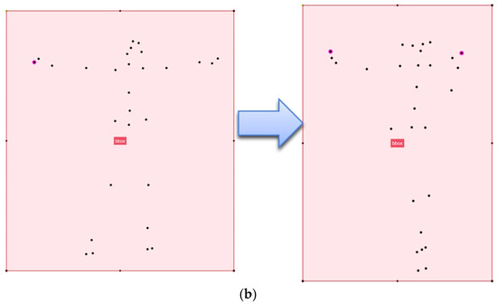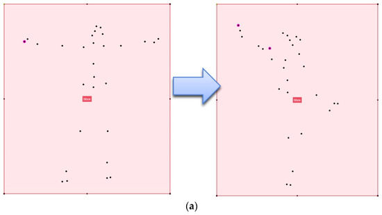 Figure 12 shows the location of dots displayed when key points in a posture are moved to those of another posture. Figure 12a is an example of a representation of a dance movement that shows a high level of difficulty in dance. This dance movement is analyzed particularly based on red dots, which indicate the ring fingers of the right and left hands among 29 key points. The x and y values at the center of the bounding box (bbox) are established as (0, 0). The ring finger of the right-hand moves from (−9, 8) to (−9, 9), and the ring finger of the left-hand moves from (9, 8) to (−4, 6). This result indicates that the right-hand shows a wider range of movement than the left-hand. The movement gap of the ring finger of the right-hand is 1, and that of the ring finger of the left-hand is 13. The proposed system determines weight based on the learning result. Figure 12b is an example of dance movement that shows a low level of difficulty in dance. The ring finger of the right-hand moves from (−9, 8) to (−6, 8), and the ring finger of the left-hand moves from (9, 8) to (3, 8). The movement gap of the ring finger of the right-hand is 3, and that of the ring finger of the left-hand is 6. The proposed system determines weight based on the Bi-LSTM learning result.