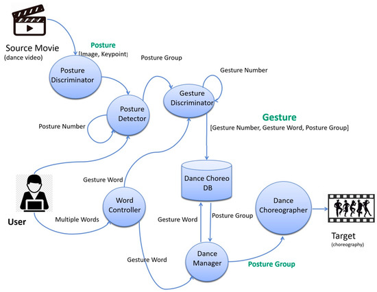 The proposed system captures the main dance movement from a source video and saves it as an image file. Then, it establishes 29 key points, which indicate the frame of a dancing character or a 3D character, on the image file and saves the result as a script file. It combines both files to generate a posture, and up to 100 postures can be generated. The posture detector receives several postures, and the user determines the number of postures to be grouped in the process. The posture detector designates posture groups by grouping postures, and these posture groups are transferred to the gesture discriminator. The posture group can be defined as a gesture and recorded in the Dance-Choreo-DB. In the following processes, the user stores gesture words and generates creative choreography. The word controller receives multiple words input by the user. The input words are sequentially recorded as gesture words, and these gesture words are stored in the Dance-Choreo-DB for the dance manager. When gesture words are already stored in the Dance-Choreo-DB, the dance manager arranges posture numbers that belong to the corresponding gesture. The dance choreographer receives the arranged posture numbers and generates creative choreography based on the data. Figure 13 shows the data flow chart of the proposed system for creative K-POP choreography generation.