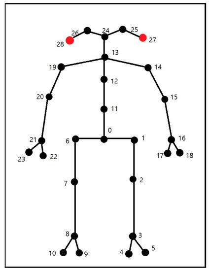 In Figure 15, numbers from 0 to 28 represent the location of the skeleton of a character. Numbers in ascending order refer to the middle buttocks, left buttock, left knee, left ankle, left big toe, left little toe, right buttock, right knee, right ankle, right big toe, right little toe, waist, chest, neck, left shoulder, left elbow, left wrist, left thumb, left ring finger, right shoulder, right elbow, right wrist, right thumb, right ring finger, nose, left eye, right eye, left ear, and right ear, respectively.